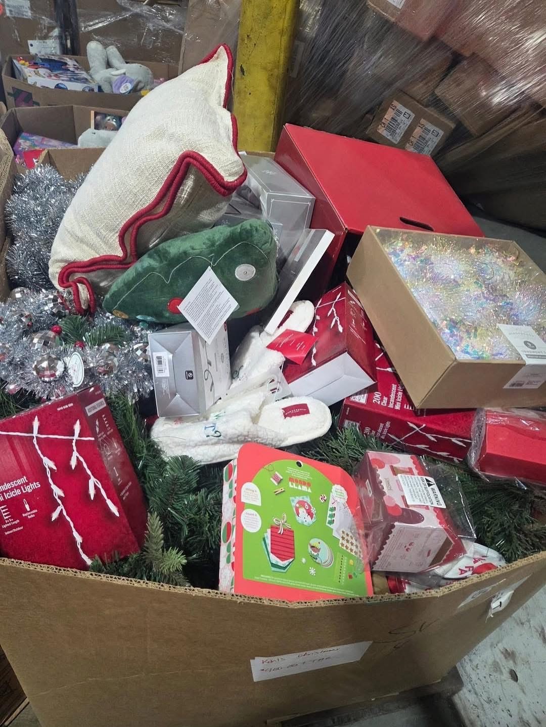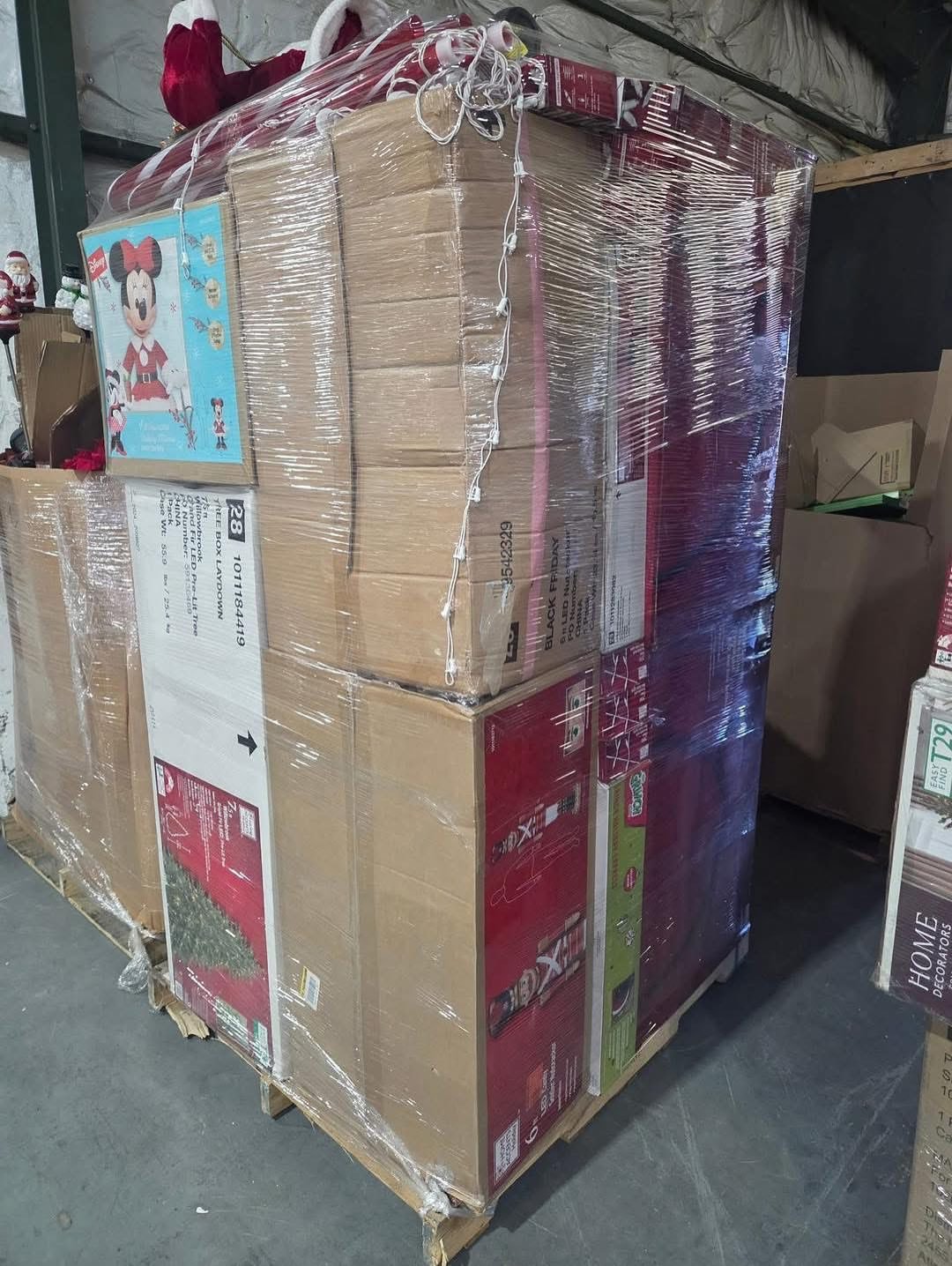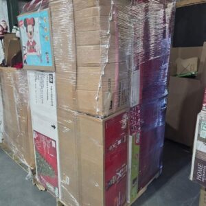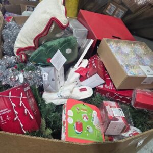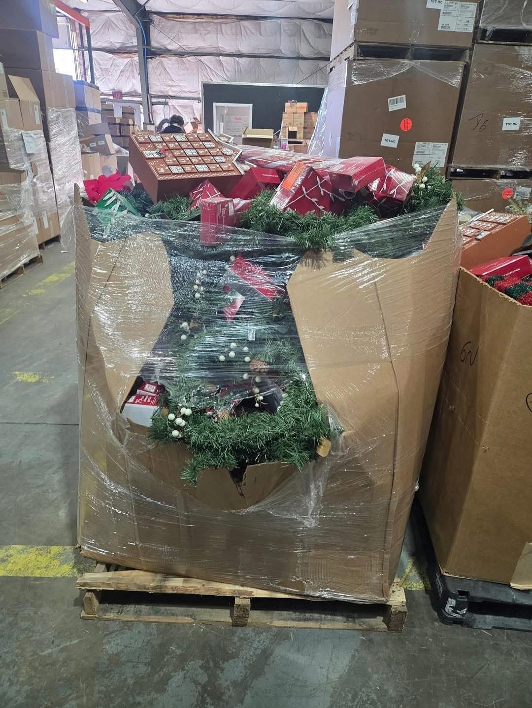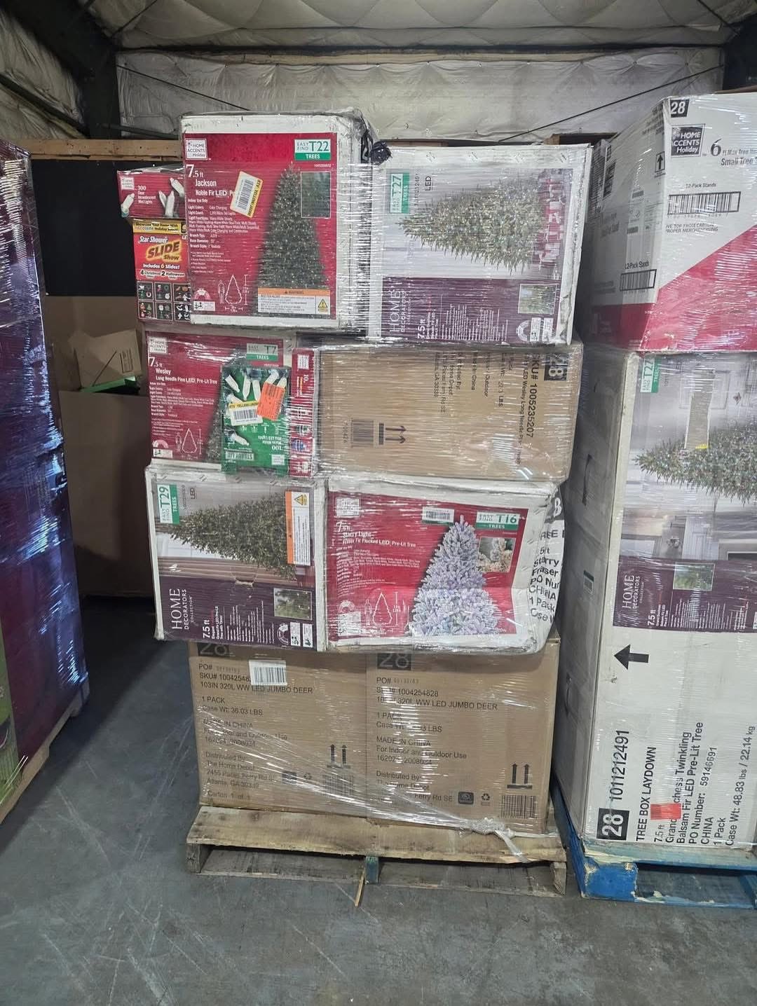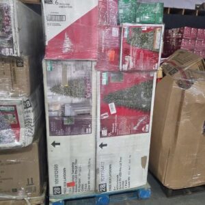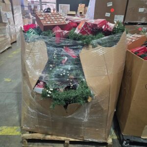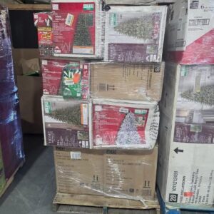 A pallet consists of Christmas trees, toys, Christmas decor and a few pajamas