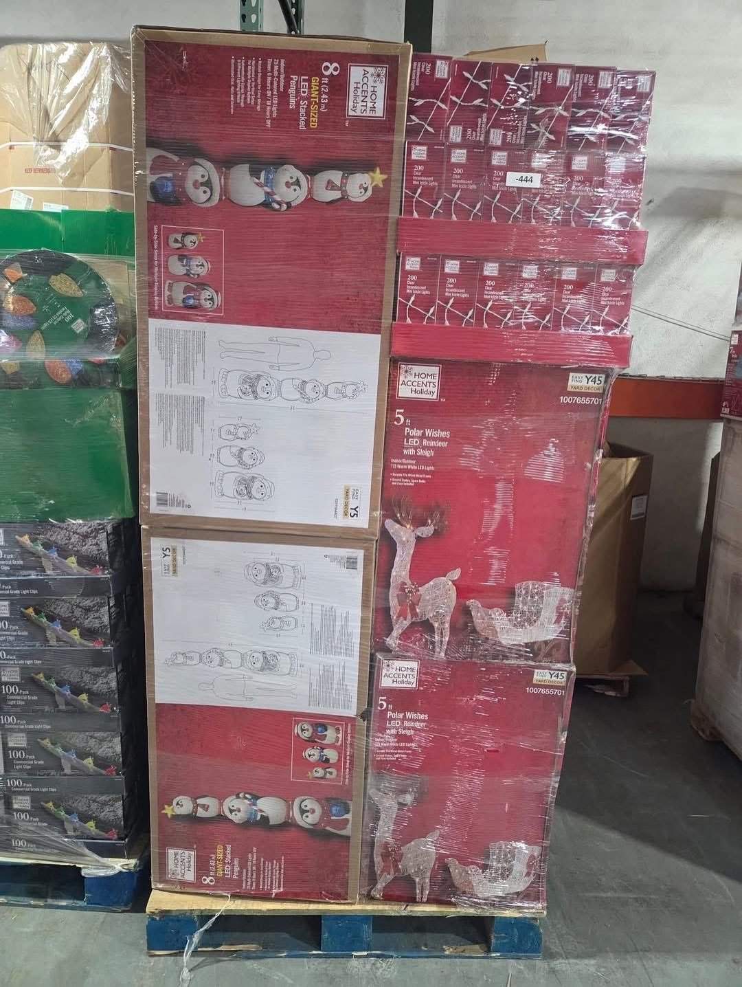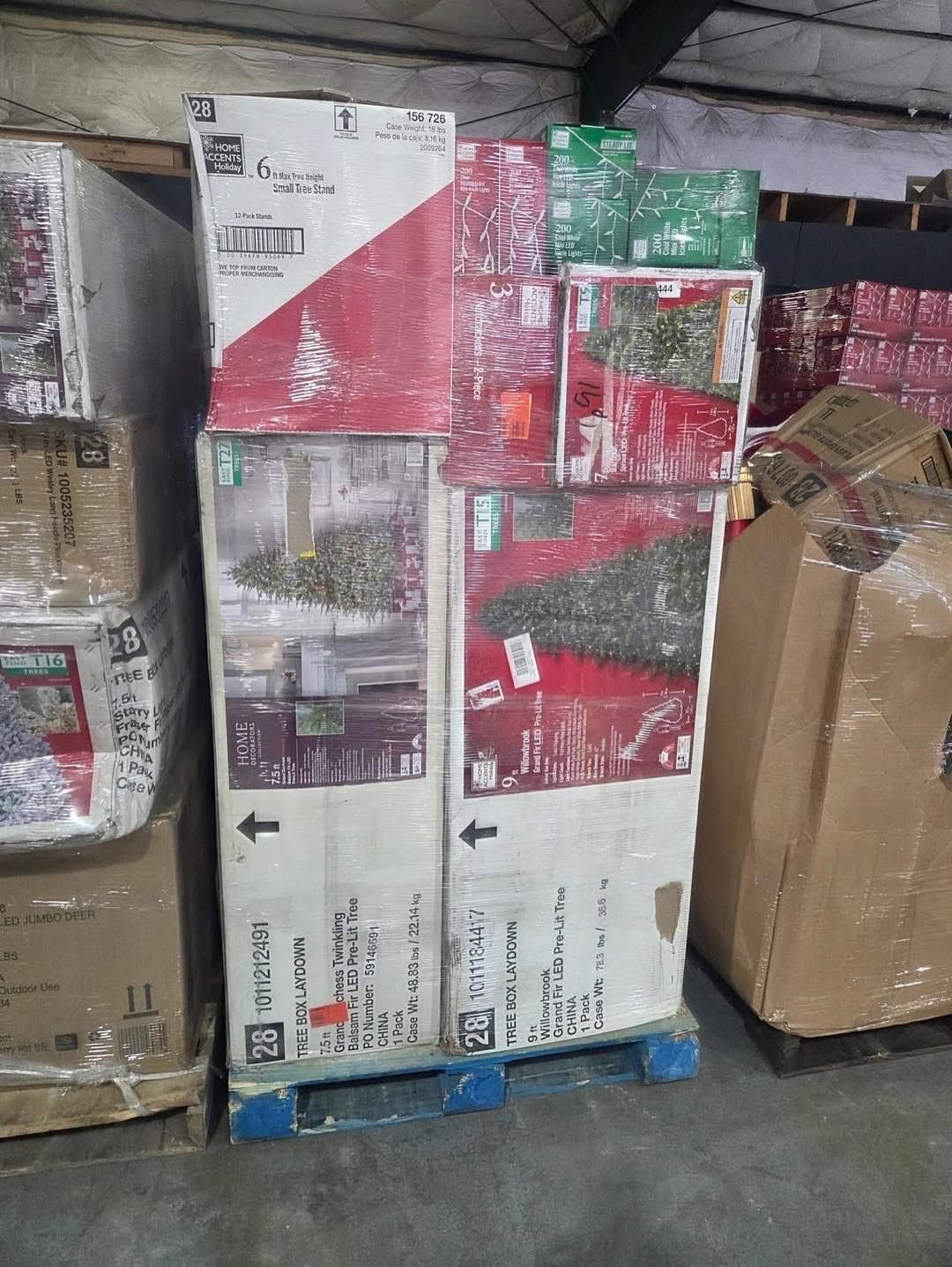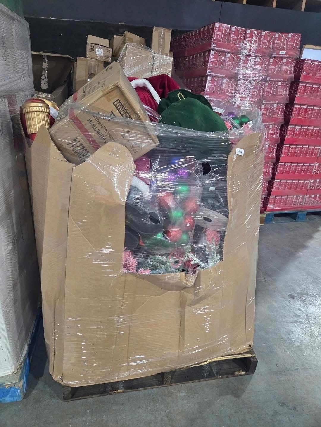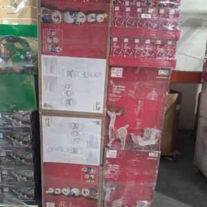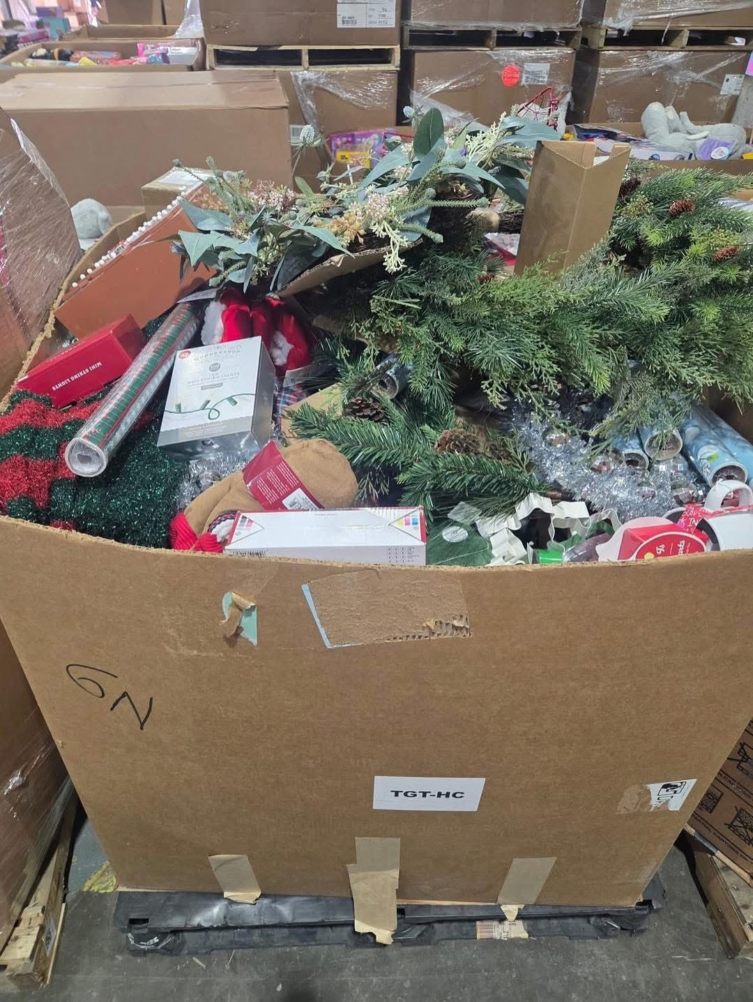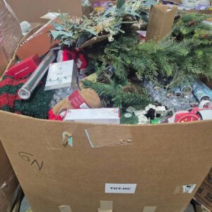 A pallet consists of Christmas trees, toys, Christmas decor and a few pajamas